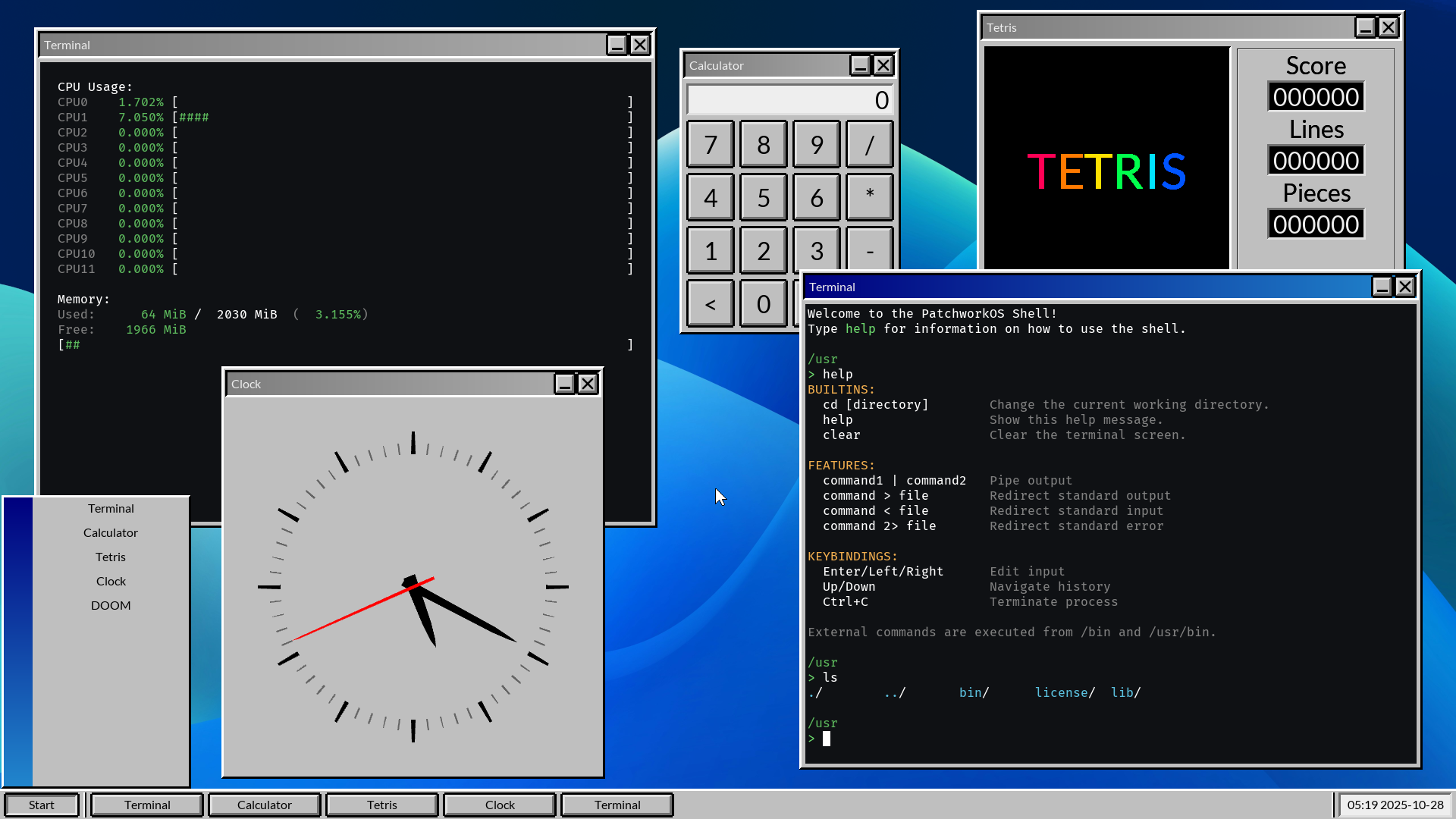 Patchwork is a monolithic non-POSIX operating system for the x86_64 architecture that rigorously follows an "everything is a file" philosophy. Built from scratch in C it takes many ideas from Unix, Plan9 and others while simplifying them and adding in some new ideas of its own.